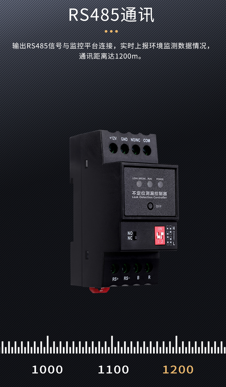 RS485通訊 | 控制器輸出RS485信號上傳泄漏數據至監控平臺,實現實時集中監控,通訊距離達1200米。 |
